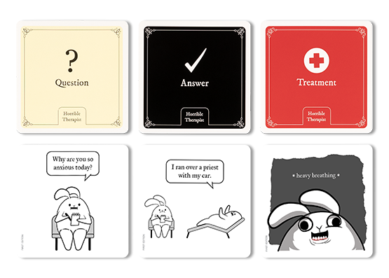 Horrible Therapist was AMAZZZZZZZING!!! I had way more fun than anticipated. And this is coming from a guy who generally doesn't like NSFW type games. I laughed so much my stomache hurt. We had so many good rounds full of laughter all around. I loved how the "judge" aka therapist in this game actually had a part to play in creating the 3 slide comic. We played 3 full rounds and at the end of the night my friends all asked, "when are we playing this again?" I've never seen my friend group take so fondly, so quickly, to a new game like this one. My only suggestion would be to have your own house rule about increasing the victory points. I had a group of 5 and twice we had someone win 3 before a second round occurred. 3 seemed to few, and we all agreed.