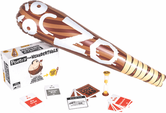 Poetry for Neanderthals is a family-friendly party game where players earn points by getting their teammates to guess words and phrases. The catch is that they can only use single syllable words to give clues. If they use any words with more than one syllable, the other team gets to bop them with a 2-foot inflatable club.