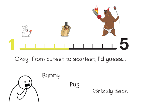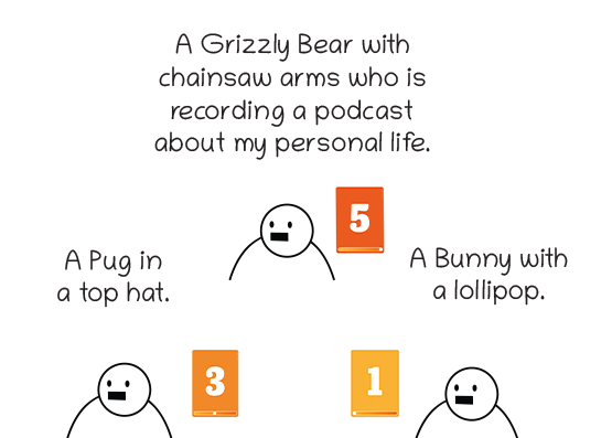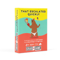 To play That Escalated Quickly: Grab and Game Edition read out a simple question (ex. I’m locked in a tiny room. What else is locked in here with me from cutest to scariest). Then everyone is assigned a secret number from one to five. Next, each player answers the question, and the intensity of that answer is based on their secret number (ex. 1= a bunny,5= a grizzly bear with chainsaw arms.) Finally, the person who read the question has to try and sort those answers into the correct order. If they get it right, everyone wins.