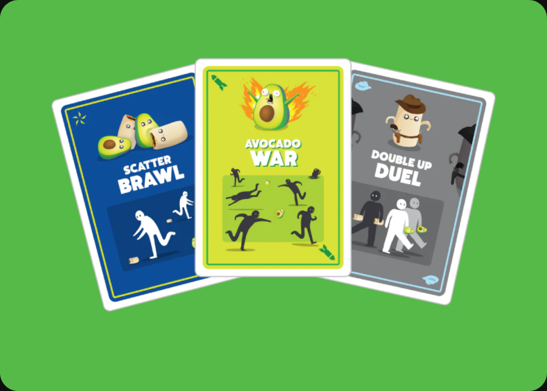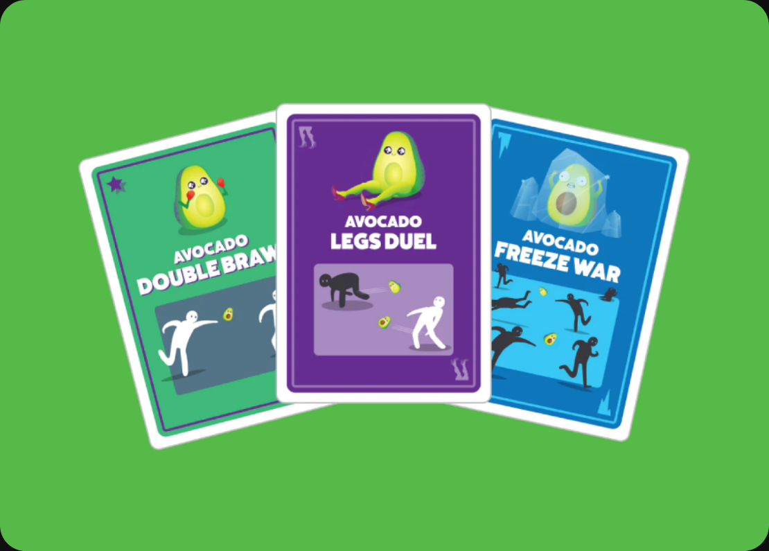 Place the pair of throwable Avocados on the table and deal out the cards. Earn points by collecting three of a kind. Play Avocado Cards and force your friends to battle. Duel to determine the winner. Duck, dodge, and dive squishy, airborne avocados or get hit and receive an Avocado Boo Boo!